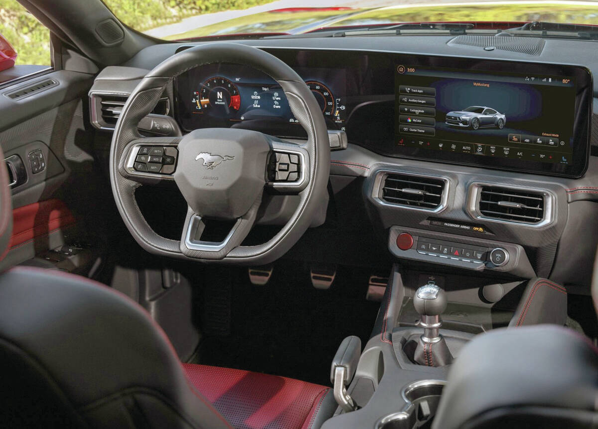 Where the exterior remains very much Mustang, the interior is a completely different story. A wide flat panel has a 12.4-inch digital instrument display that’s fully configurable. Drivers can show as much or as little information as they wish. To the right, a 13.2-inch touch-screen operates most of the vehicle’s variable functions such as infotainment and climate. Just one knob is present and it controls the audio volume.
