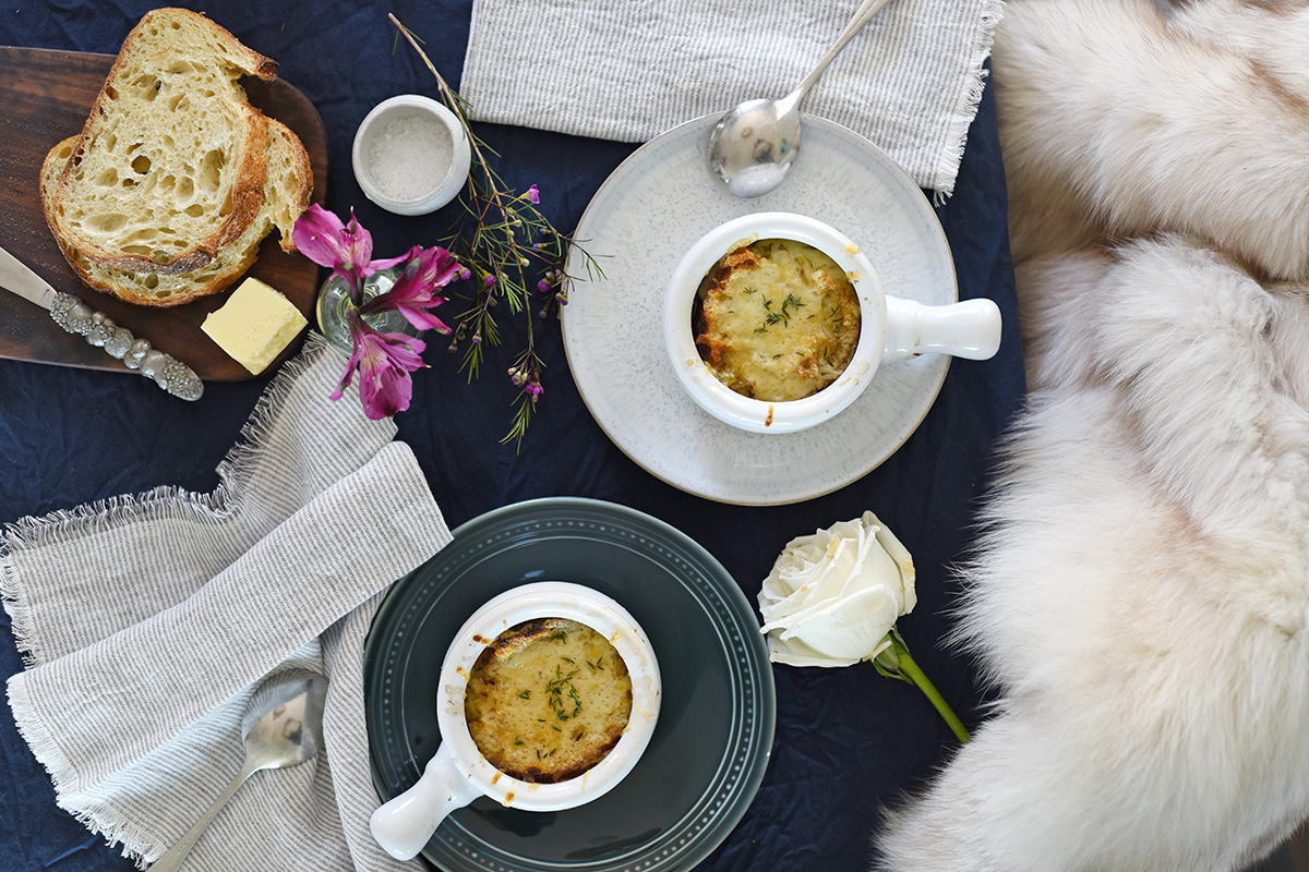 I first learned how to make this soup while participating in a culinary course in Paris in my mid-20s. Our extremely traditional Normand teacher insisted that two onions per person was an appropriate ratio, although if you’re using very large onions, one per person seems to be enough. That, I leave up to you. Either way, it truly is the most satisfying supper on a cold and stormy night, or a surprisingly simple, yet always appreciated starter for a French-themed dinner party. The oniony broth base can certainly be made ahead of time for added ease—I’ve personally kept it in the fridge for a few days and just sliced, toasted, grated and broiled as needed throughout the week, and have also found that it freezes quite well for the preppers and planners in the audience.